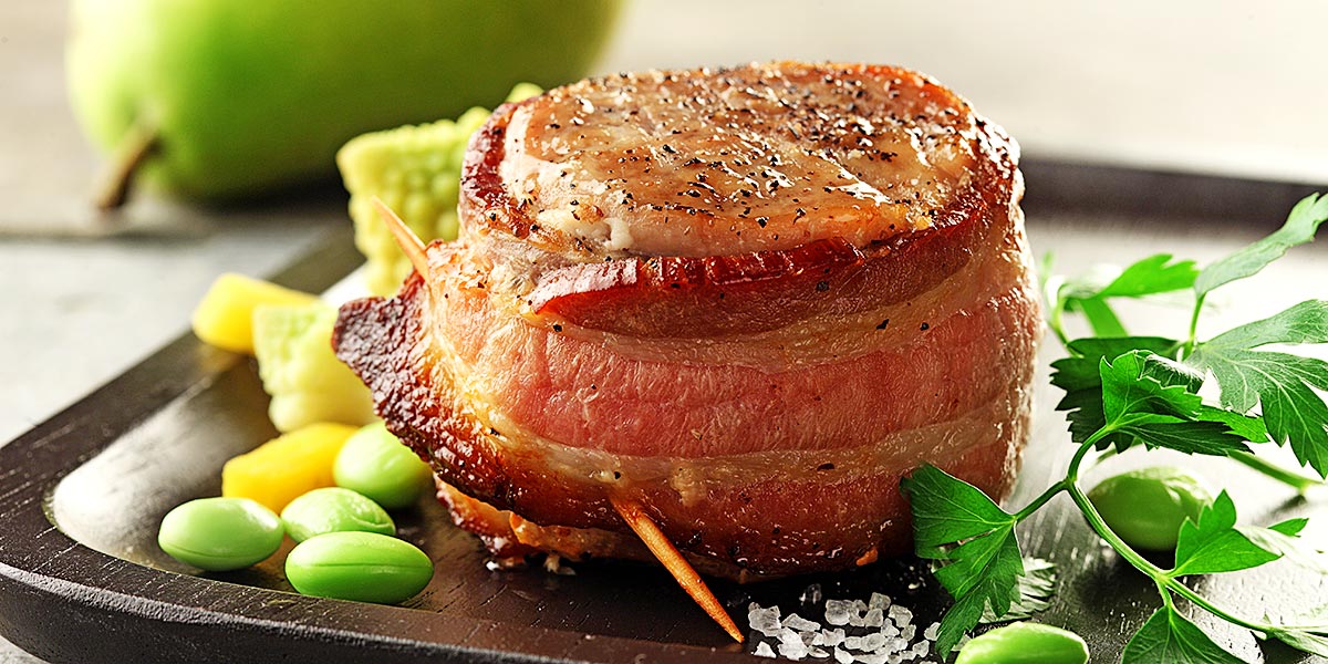 - Place two medallions together. Wrap bacon slice around both pieces to hold together. Secure with wooden toothpick. Repeat with remaining medallions and bacon.