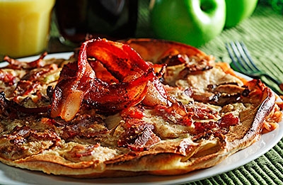 - Arrange seasoned apple slices over bottom of skillet. Sprinkle with bacon pieces.