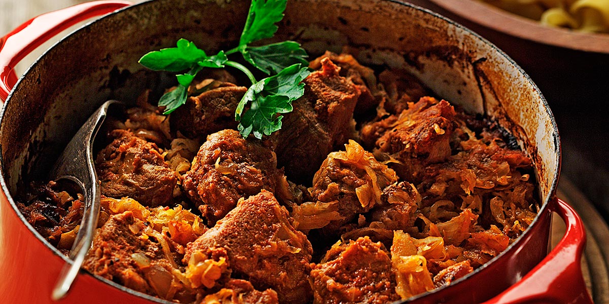- Place pork cubes and onions in casserole pot or small enamel roaster.