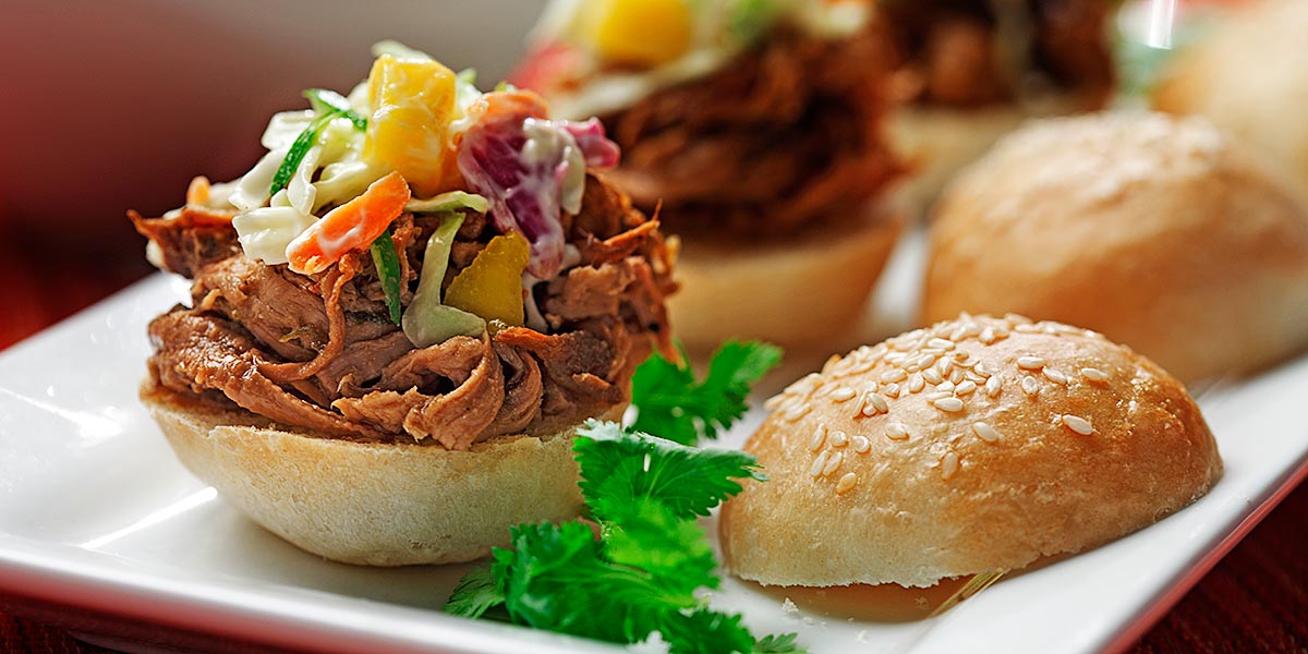 - Pile pork onto bottom half of bun. Top with Mango Slaw and other half of bun. Repeat with remaining buns.