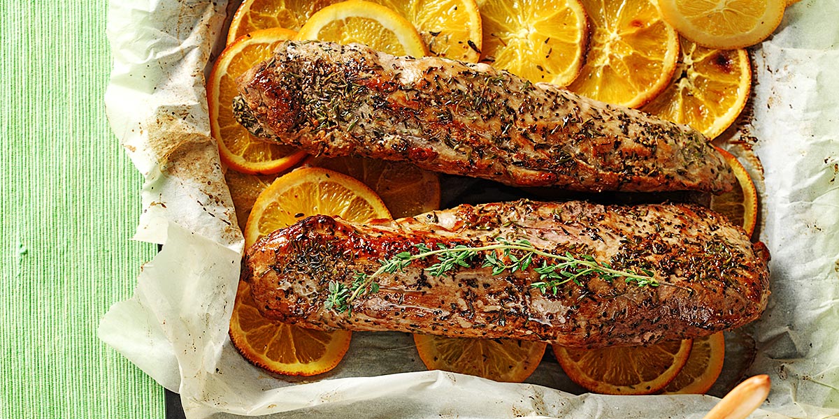 - Meanwhile, line bottom of a baking dish with orange slices. Place tenderloins on top of orange slices. Roast for 25-30 minutes or until instant-read thermometer registers 155°F.