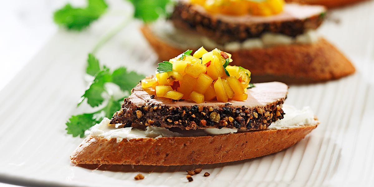 - To serve, lightly toast baguette slices and spread with a small amount of the cream cheese mixture. Top with a tenderloin slice. Spoon a dollop of mango salsa onto each serving.