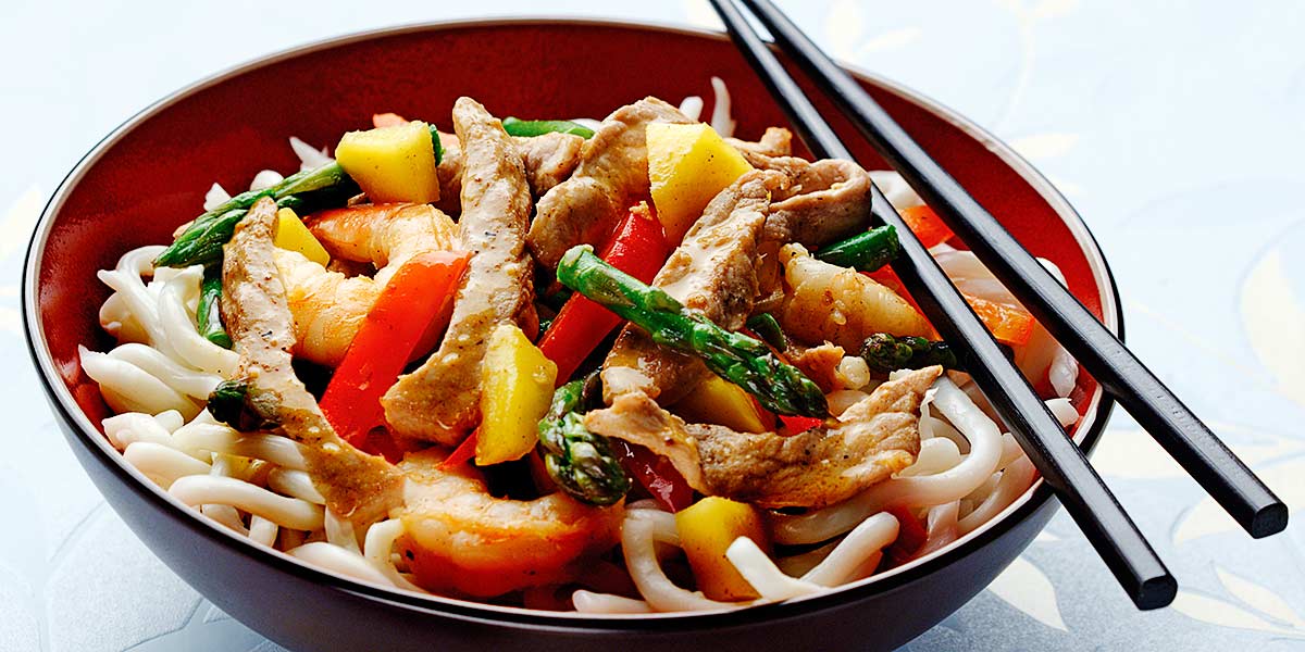 - Return pork, shrimp, vegetables and mango to skillet and heat through. Serve immediately over prepared Asian noodles (e.g. udon, soba or rice noodles).