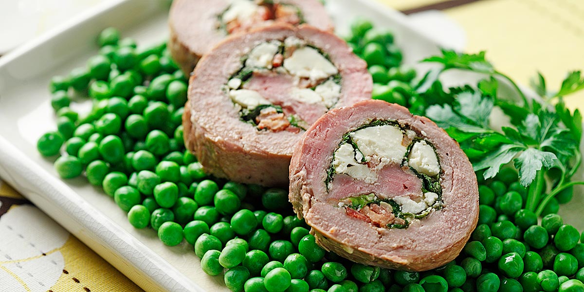 - Layer spinach, feta and bacon on tenderloin, leaving some room around the edges.