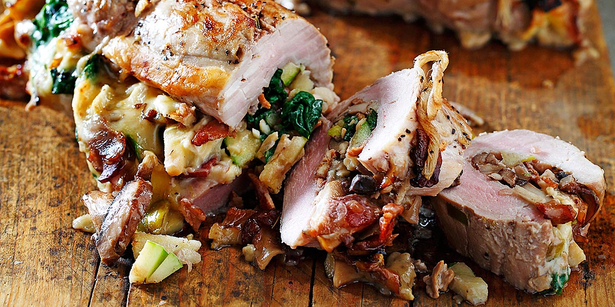 - Spoon half of the stuffing onto one half of each tenderloin. Fold over other half of tenderloin to enclose stuffing. Tie with butcher string in 3-4 places.