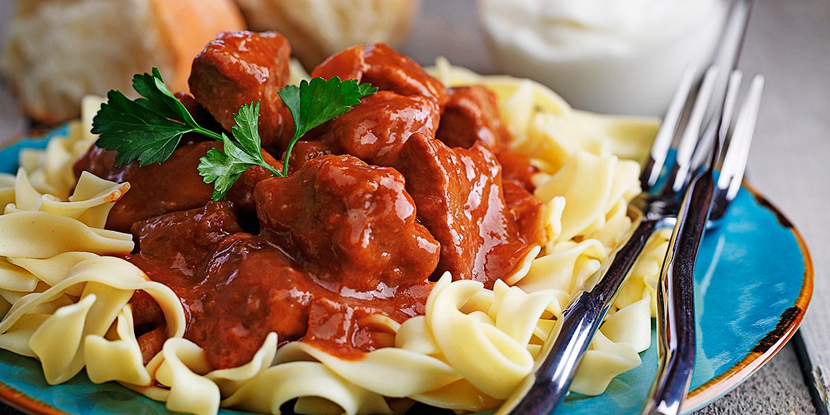 - Serve goulash over hot cooked egg noodles. Garnish with parsley.